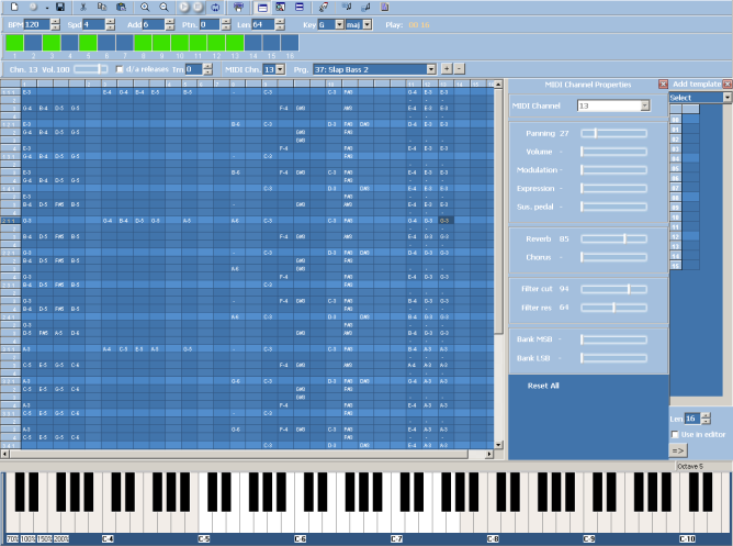 MIDI Tracker is music editor with ability to import and export songs to MIDI format, support of 128 instruments, assigning volume and tracks count, playing and editing from PC keyboard.